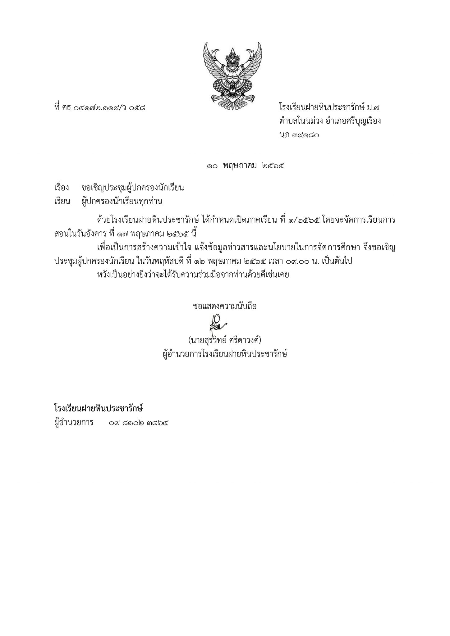 เพื่อเป็นการสร้างความเข้าใจ แจ้งข้อมูลข่าวสารและนโยบายในการจัดการศึกษา จึงขอเชิญประชุมผู้ปกครองนักเรียน ในวันพฤหัสบดี ที่ 12 พฤษภาคม 2565 เวลา 09.00 น เป็นต้นไป